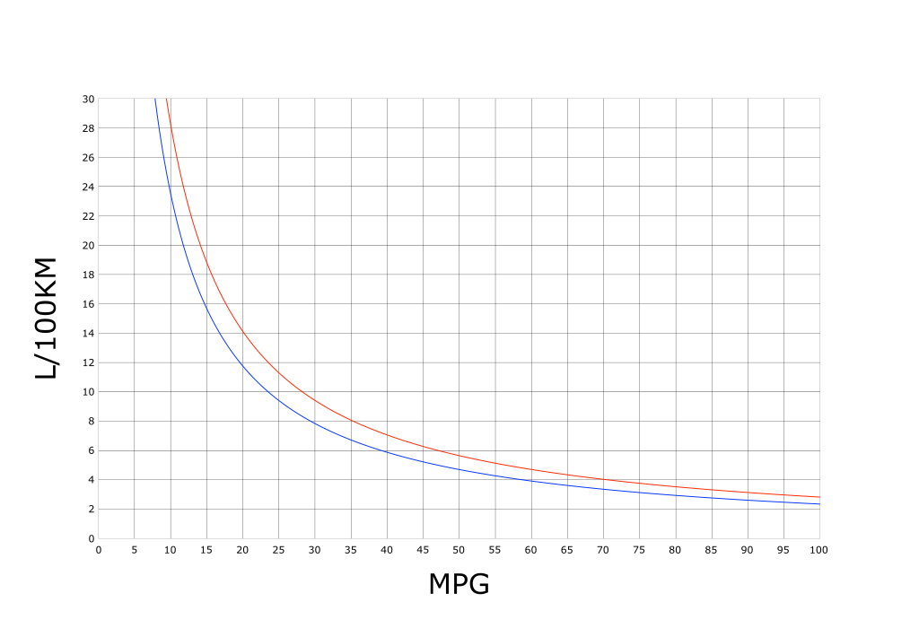 نمودار تبدیل MPG به L/100: آبی، گالن در واحدهای ایالات متحده؛ قرمز، گالن بر حسب واحدهای بریتانیا